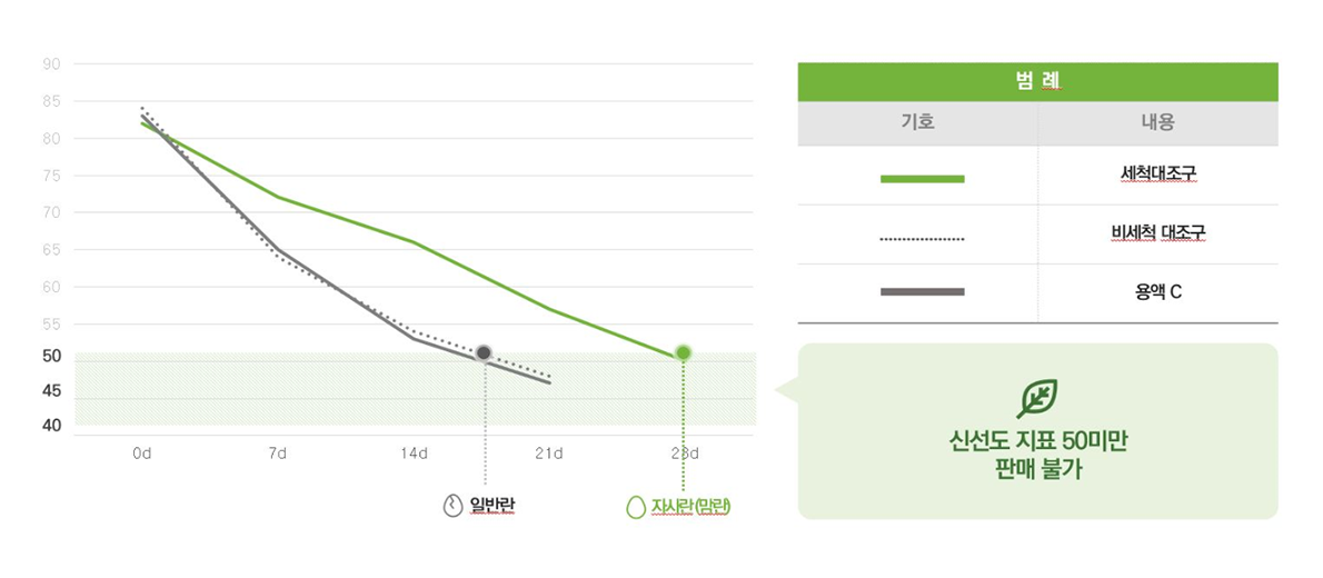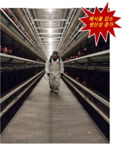 코팅액 제조공장 친환경 신선도 유지 및 항균코팅액 제조 - 연 3,600t 품목 폴리페놀계열 나노코팅액 적용가능식품 계란, 딸기, 귤, 기타신선식품 생산량 10TON/일 시설 현황 구분 공장 / 창고 시설 면적 (㎡) 738 그린바이오 솔루션I - 폴리페놀 나노코팅제 "아이필굿" 원란세척공정에 설치된 나노코팅설비 식품코팅제 - iPeelGood 살모넬라균 90%이상 제거효과 검증 살균전 살균후 <신선도 유지 기간 비교> 그린바이오 솔루션II - 친환경 축산방역소독제 "솔리뮨" 소독제 제조설비 축산방역소독제 - SoliMune 축사 전체 소독 축사 내부 직접 소독 가능 <기존소독약 대비 폐사율 60% 감소 및 6,800만원 추가이익 (18개월/5만수 기준) 자가농장 시험도포를 통한 단가 및 효율성 비교(8주) 구분 타사제품(4급암모늄 소독약) 당사제품(솔리뮨) 비고 사용장소 축사내부(500평 기준) 축사내부(500평 기준) 판매단가 11,750원/L 15,000원/L 소독배율 240배 166배 권장 도포 횟수 2일 간격(월 15회) 2주 간격(월 2회) 1회 소독 시 사용량 1L/평 1L/평 구매비용/월 367,188원 300,000원 추정손익(20주~80주 기준 / 60주간 사용기준) 총 소독약 소모비용 5,140,625원 4,500,000원 폐사율(5만수 기준) 5마리/일(0.01%) 2마리/일(0.008%) 1,680수 추가 생산가담 추정이익 KPI 표준 폐사율 대비 88% 감소 12,936,000원 중추가격 7천원 산정 잠재 계란 생산수 620,928개 계란 잠재 매출금액 99,969,308 사료추정금액 약 4000만원 추정 이익액 67,917,645원 사료값, 소독약 사용비용 삽입 ※ 당진 자가농장 5만수 기준 / 80주간 실험데이터를 토대로 작성된 추정치로 실제결과와 상이할 수있음. 축사 주요 오염원 소독 축사 내부 직접 소독 (월2회) <기존소독약 대비 폐사율 3.4% 감소 및 10억원 매출상승효과 (18개월/5만수 기준) 자가농장 시험도포를 통한 단가 및 효율성 비교(8주) 구분 Pre(전) Post(후) 비고 질병발생유무 有(저병원성 조류독감) 無 질병에 취약함 산란율 67.68% 93.12% 누적산란수(알) 12,439,196 19,124,646 폐사율 6.4% 2.8% 약품사용액 약 300만원/월 약 100만원/월 총 생산액 18억 6천만원 28억 6천만원 안전성 이상 無, 생산성 비약적 향상 ※ 협력농장대상 5만수 기준 / 80주간 실험데이터를 토대로 작성된 추정치로 실제결과와 상이할 수 있음.