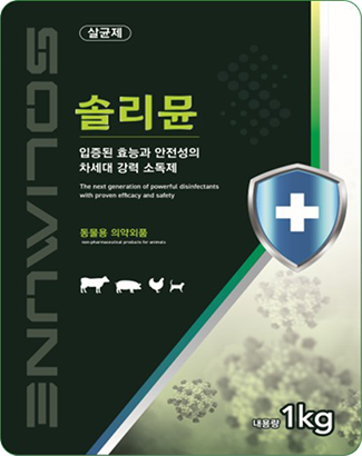 유해균의 생장을 억제하는 식약처 인증 식품 첨가물로 제조된 친환경 소독제 구매하기 Natural TA-Fe3+ -MPS Spraying 축사뿐만 아니라 일상생활에도 광범위하게 적용가능한 소독제 SoliMune 식물추출 천연물질(탄닌)로 인체에 무해 FDA인증 첨가물 사용으로 안정성 확보 용이한 사용(사용자가 직접 원하는 시설 내부에 살포 가능) 살포 후 효과지속시간이 길어 생산성 향상 및 인건비 절감효과 농/축사는 물론 일상 생활환경에 광범위하게 적용 가능 다양한 제형으로 제작 가능(사료, 액상, 제제 등) 산란계,육계 농장 - 조류독감, 살모넬라균 차단 및 사료효율 재고효과 양돈 농장 - 생식기호흡기증후군(PRRSV) 항체 생성 촉진 및 면역력 강화 한우/낙농 농장 - 송아지 설사병(로타 바이러스) 발병율 감소 및 면역력 강화